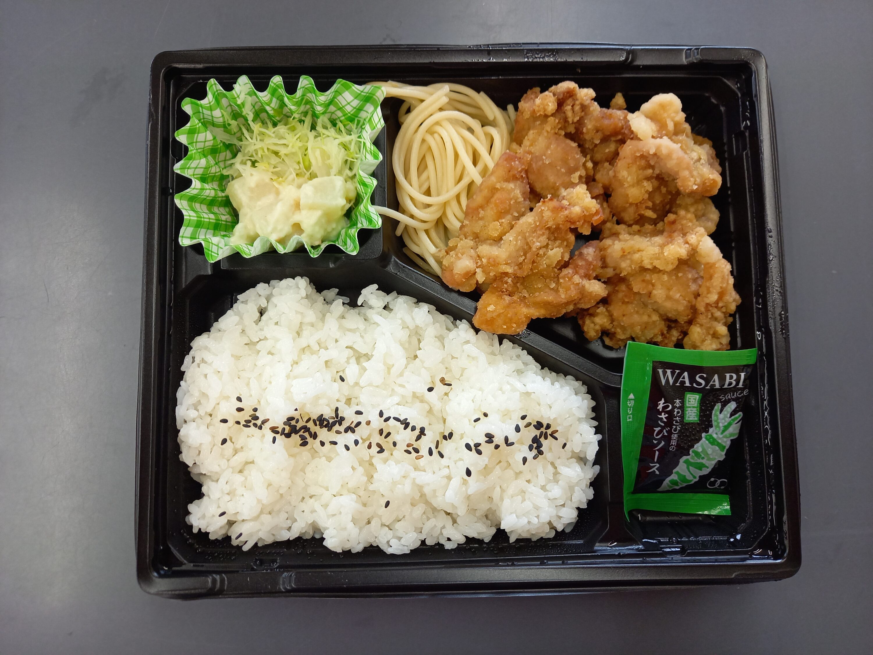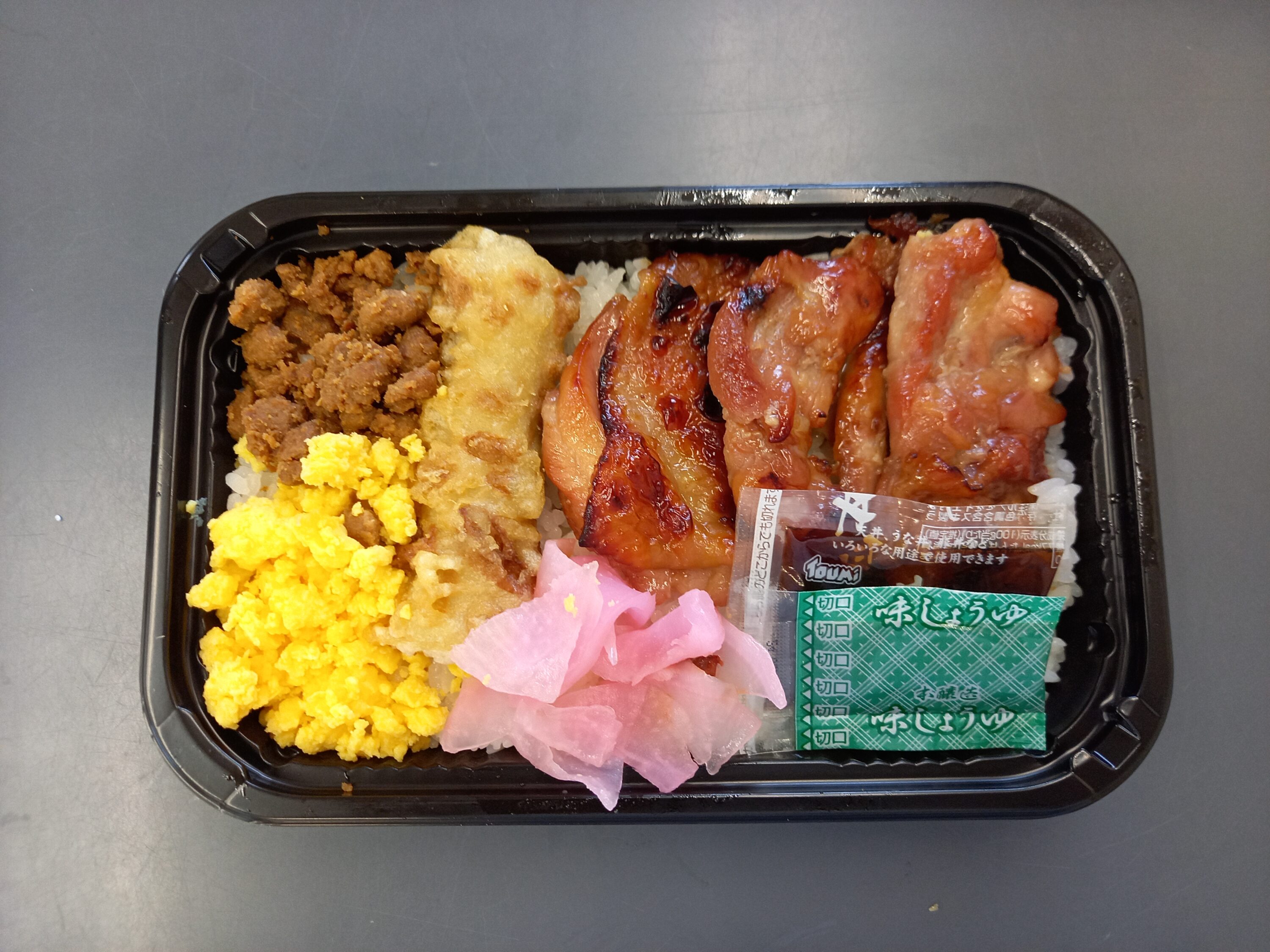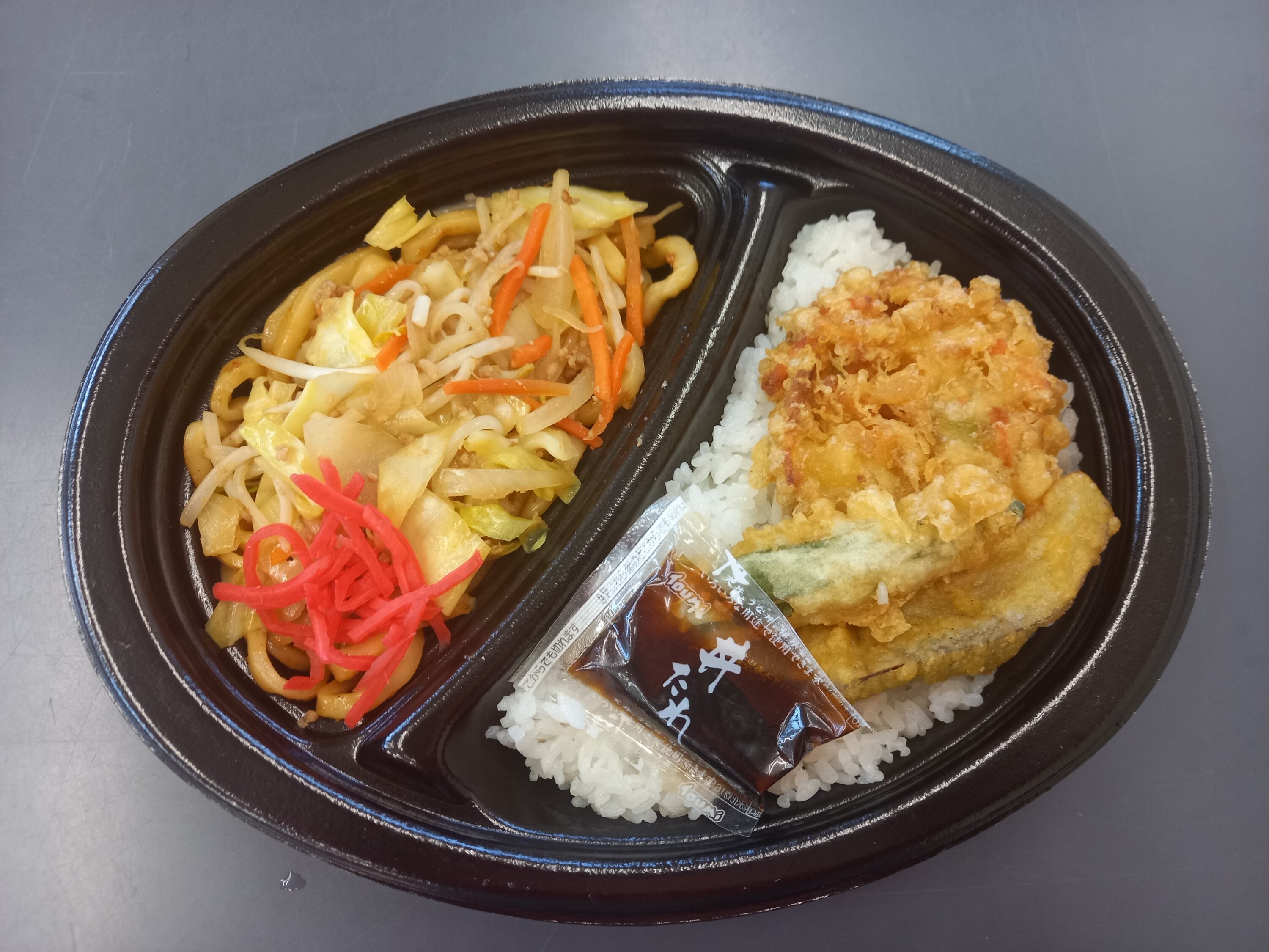 月 限定日替わり ミニ天丼と焼きうどん 献立内容エビ天、とり天、南瓜天とだしのきいた焼きうどん、通称「どん丼」と呼んでいます。ダブル炭水化物です。夕食はちょっと控えめに! エネルギー753kcal 塩分3.8g