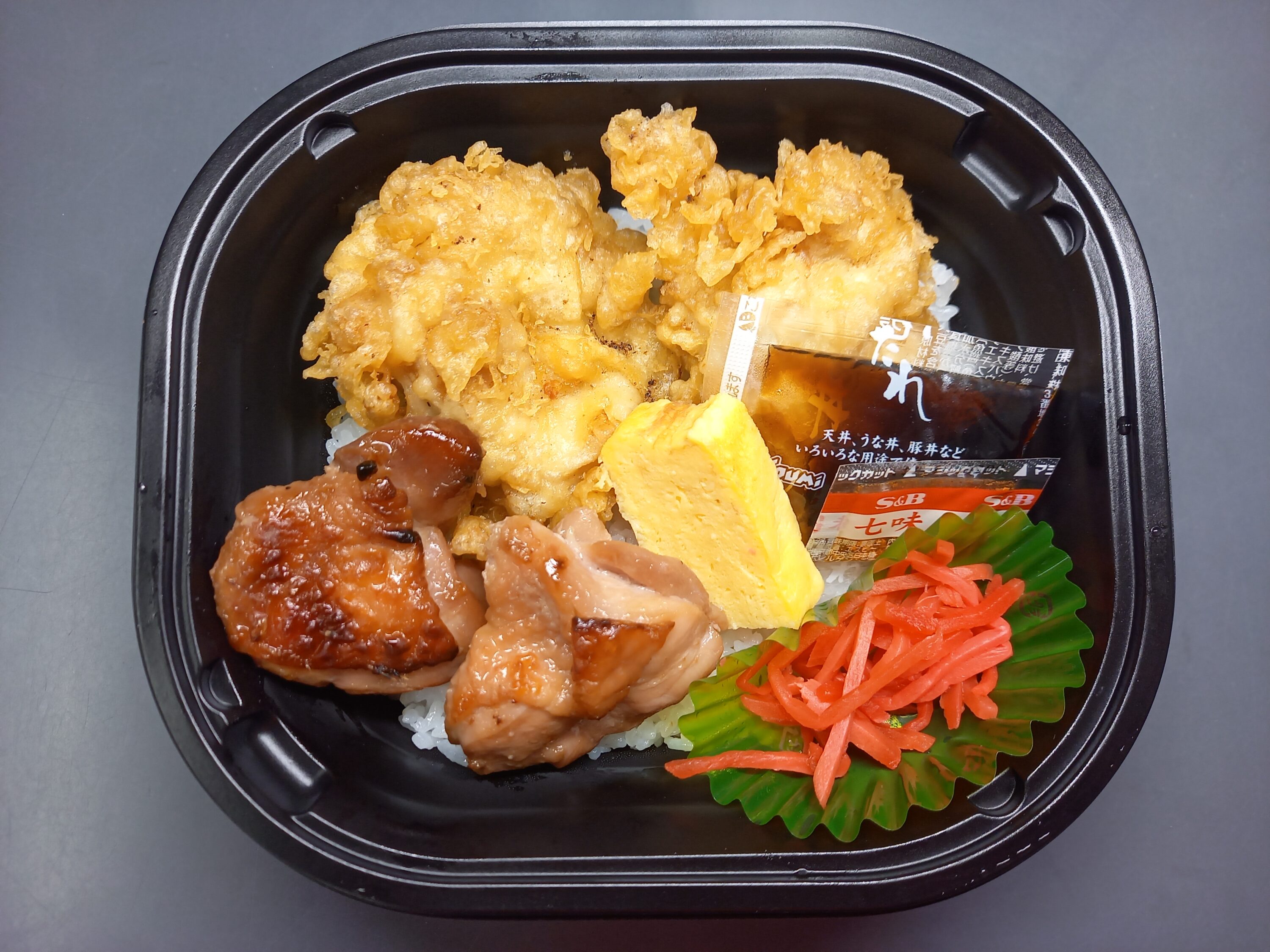鶏照り焼き、白身フライ、鶏唐揚げ、竹輪天、玉子焼き、ウィンナー