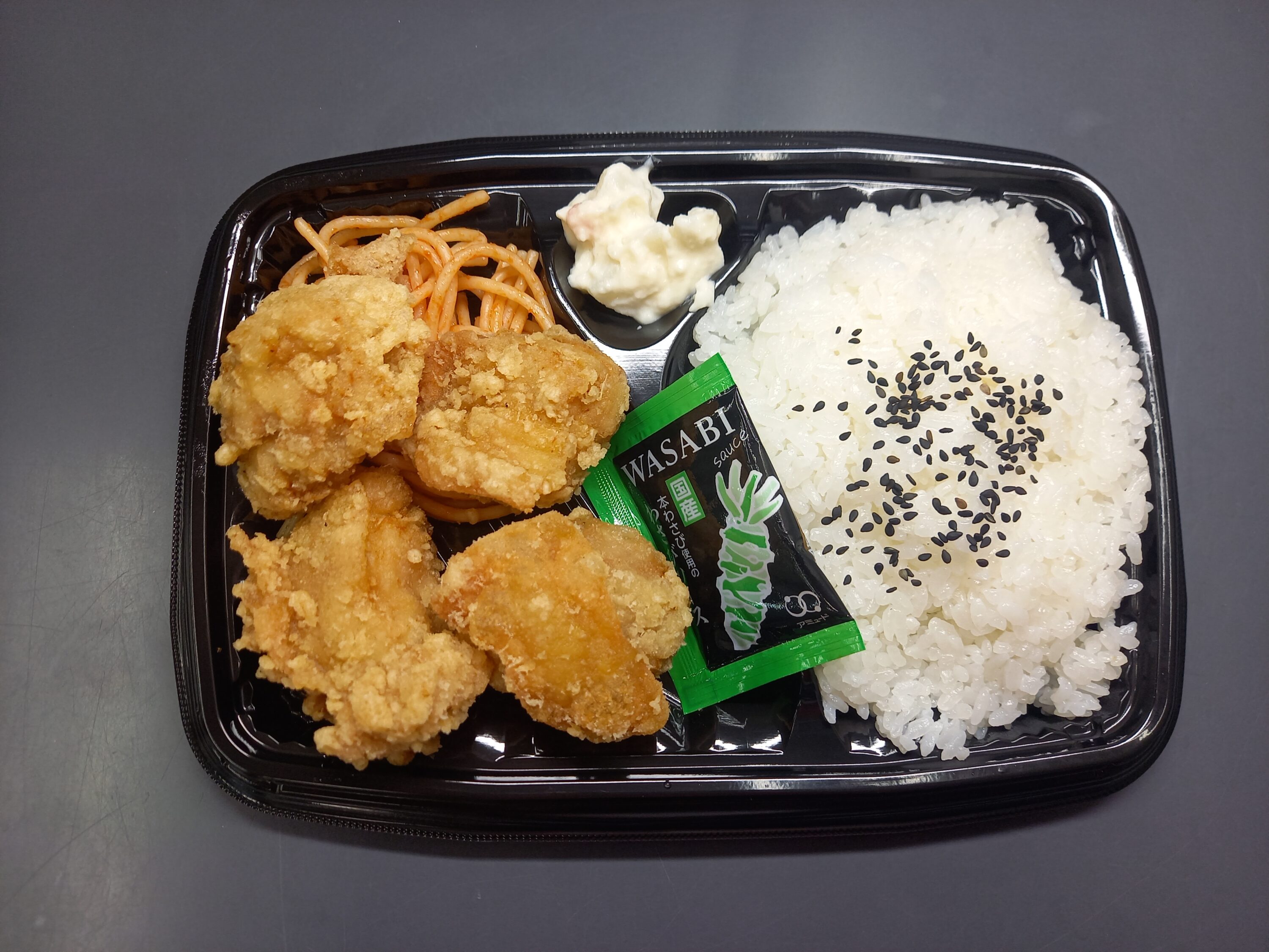 木 限定日替り 若鶏の唐揚げ弁当 献立内容ジューシーな肉の旨味とほどよい塩分と唐揚げの香りが食欲をそそります。付け添えのパスタはトマトパスタにしました。 今回は山葵ソースを添えてます。 エネルギー816kcal 塩分3.0g